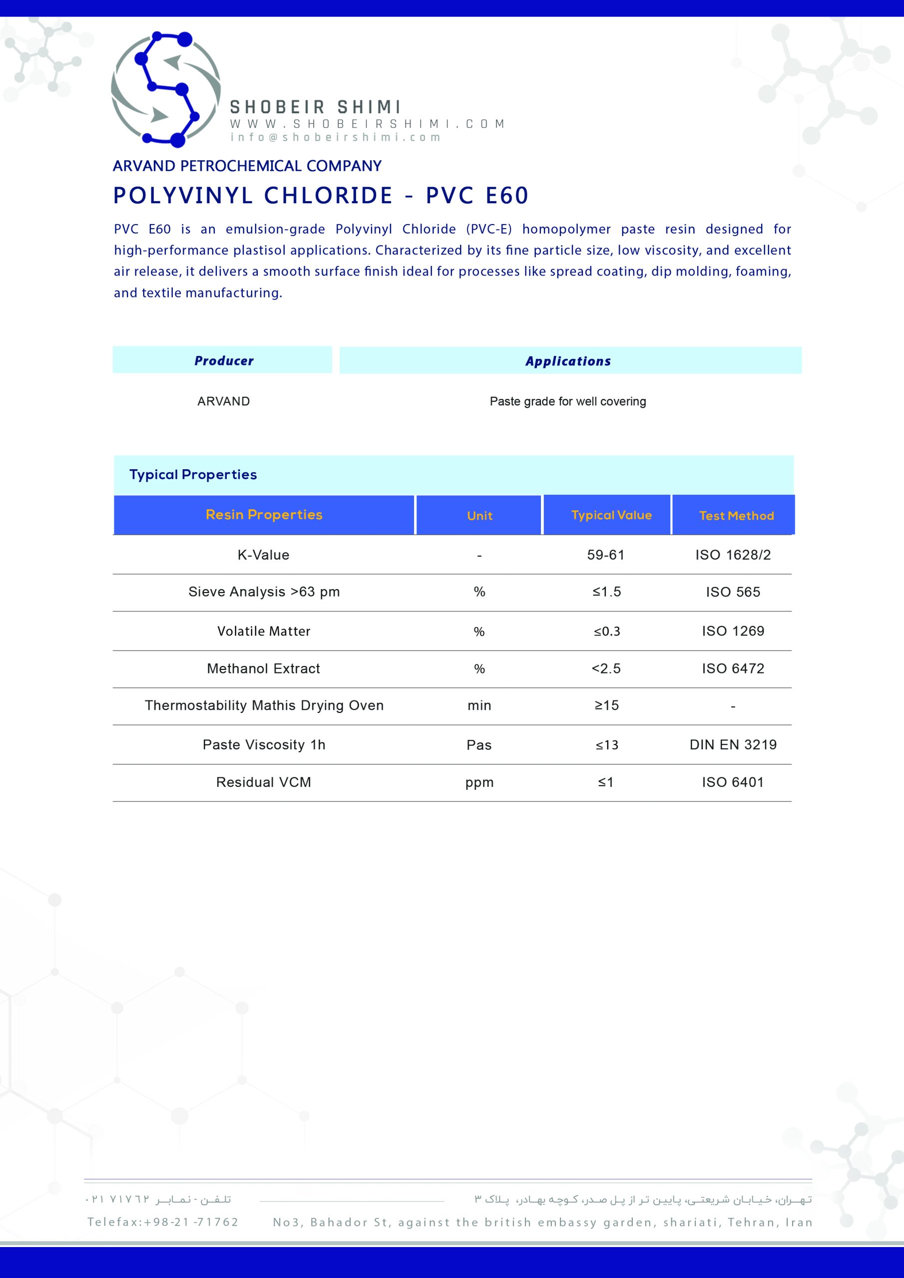Looking to buy PVC E60 from Iran at a competitive price? Contact Shobeir Shimi today for an instant quote, stock availability, and the complete technical data sheet.